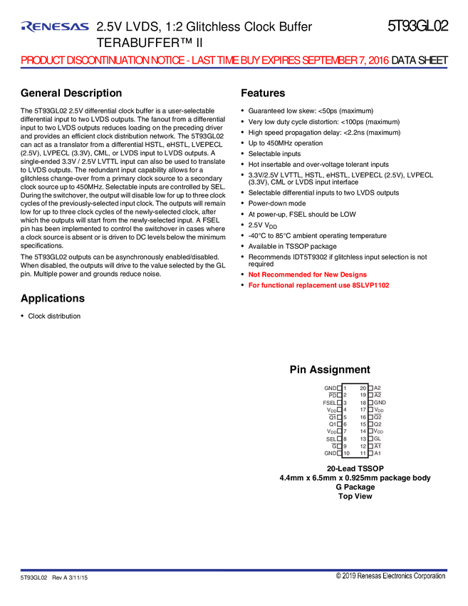 5T93GL02 2.5V LVDS,1:2 Glitchless Clock Buffer Terabuffer™ II