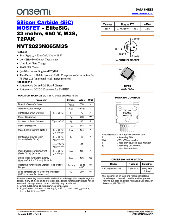 NVT2023N065M3S Silicon Carbide (SiC) MOSFET – EliteSiC, 23 mohm, 650 V, M3S, T2PAK