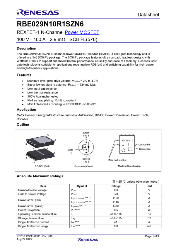 100V, 160A, 2.9mΩ, REXFET-1 N-Channel Power MOSFET in SO8-FL (5x6)