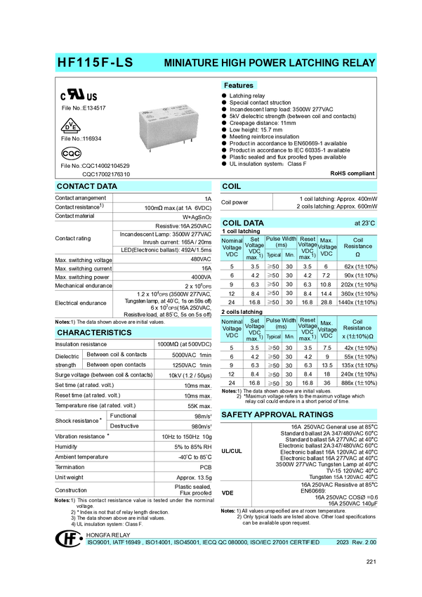 HF115F-LS/24-HL2F Przekaźnik elektromagnetyczny; 24V DC; bistabilny; 1 styk zwierny SPST-NO;...