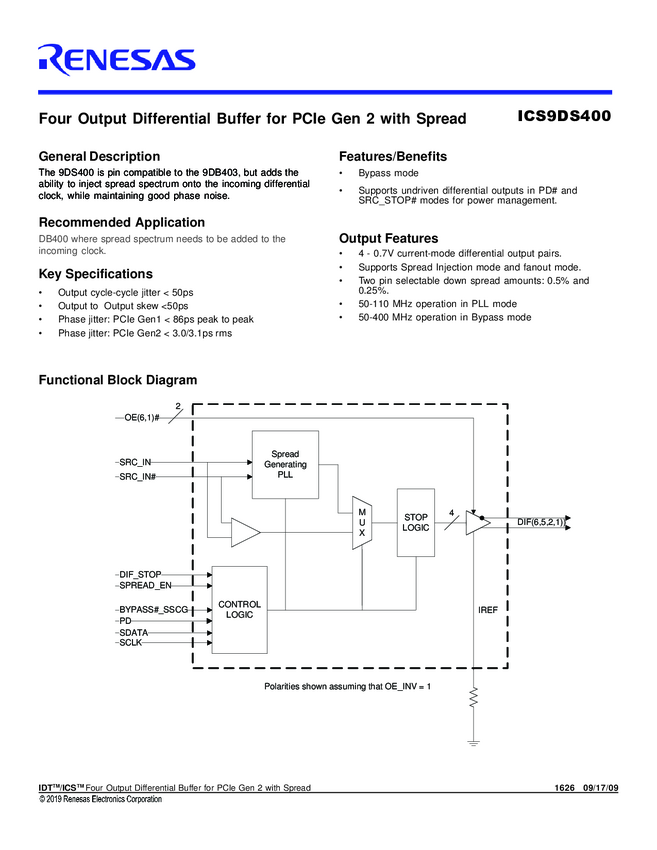 9DS400AGLF 4 output PCIe PLL with spread injection