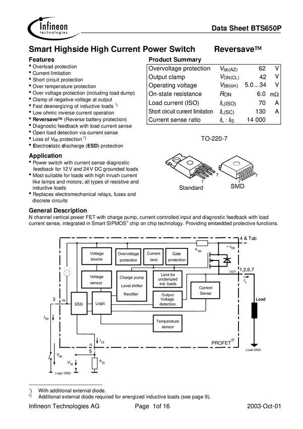 Układ scalony; BTS650P; IC; power switch; 70A; 5-34V DC; 170W; 6mOhm; wysokie zobacze; N-MOSFET; D2PAK (TO263-7); THT; BTS650PE3180A; INFINEON; RoHS
