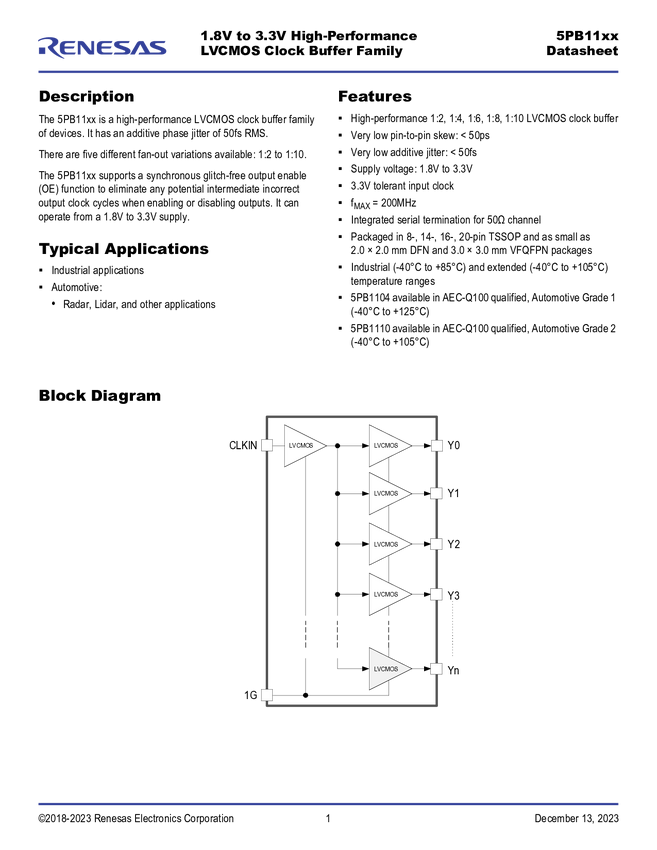 5PB1102PGGI 1.8V to 3.3V 1:2 LVCMOS High-Performance Clock Buffer
