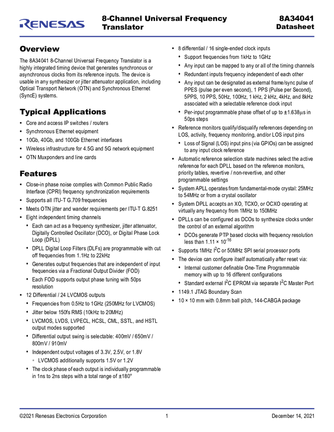 8A34041B-000AJG Multi-Channel DPLL/DCO - Eight Channels