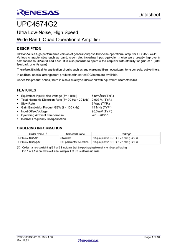 UPC4574GR-9LG-E1-A High-Voltage, Bipolar Quad Operational Amplifier, Dual-Power Supply, Ultra...