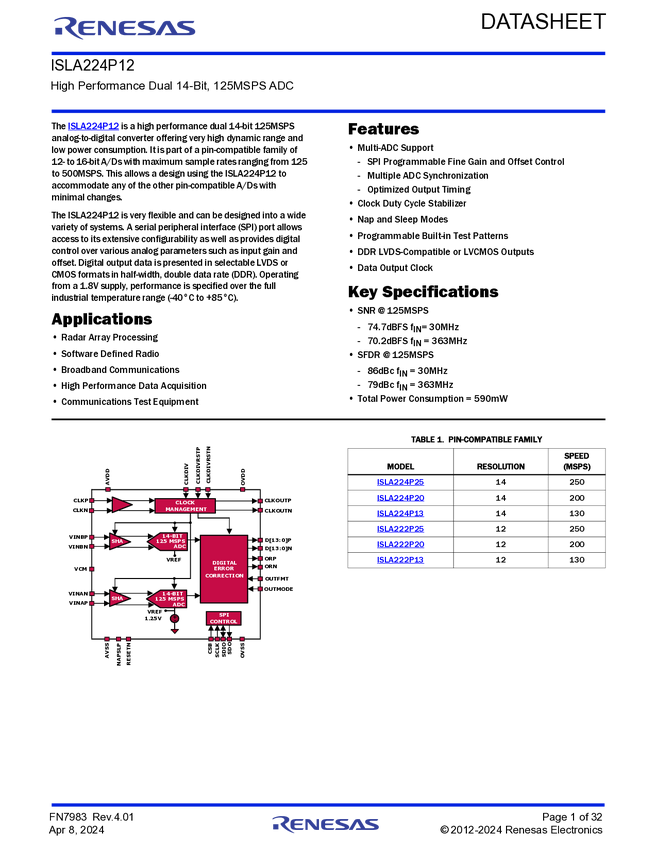 ISLA224P12IRZ High Performance Dual 14-Bit, 125MSPS ADC