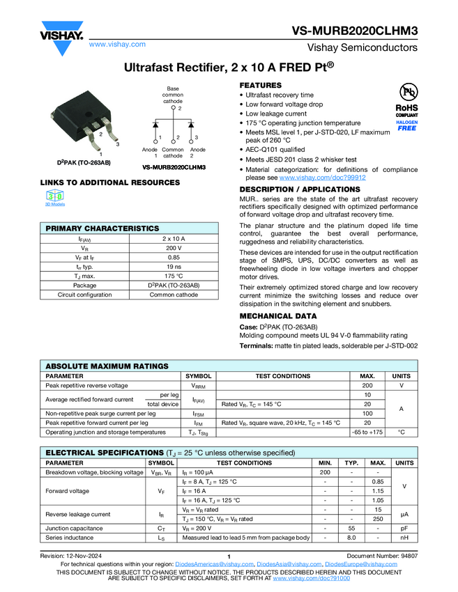 VS-MURB2020CLHM3 Ultrafast Rectifier, 2 x 10 A FRED Pt®