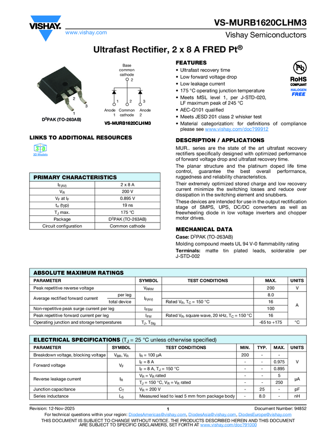 VS-MURB1620CLHM3 Ultrafast Rectifier, 2 x 5 A FRED Pt®