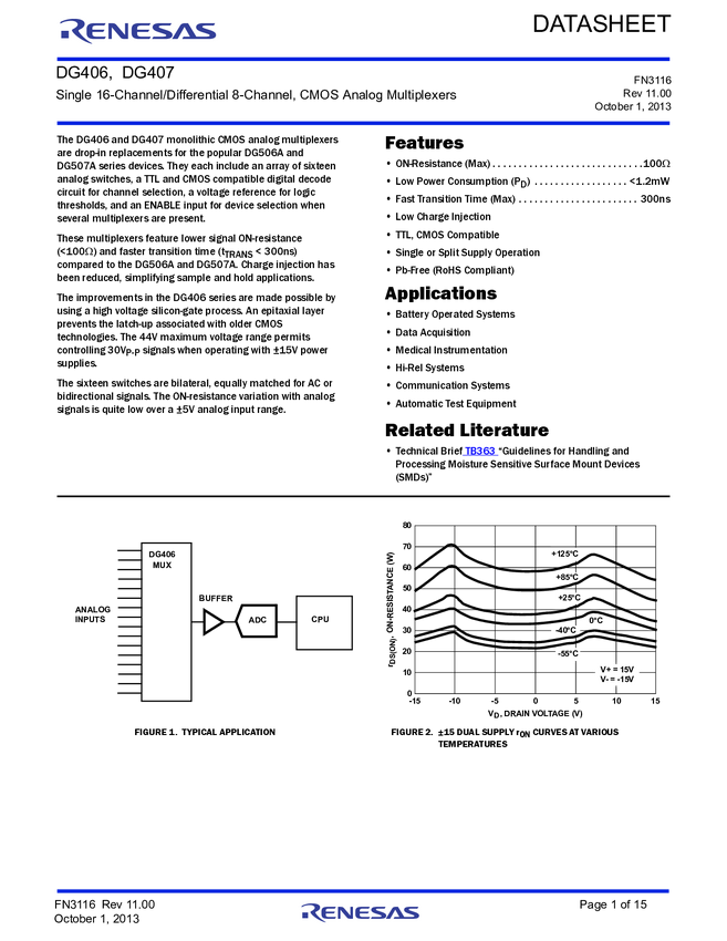 DG406DJZ Single 16-Channel/Differential 8-Channel, CMOS Analog Multiplexers