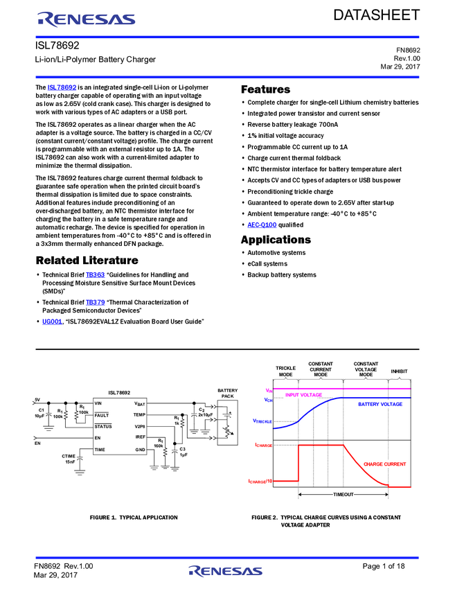 ISL78692-1CR3Z Li-ion/Li-Polymer Battery Charger