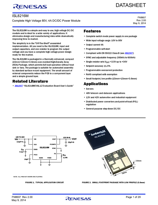 ISL8216MIRZ Complete High Voltage 80V, 4A DC/DC Power Module