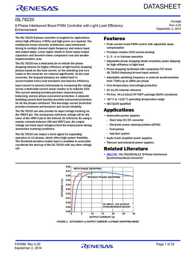 ISL78220ANEZ 6-Phase Interleaved Boost PWM Controller with Light Load Efficiency Enhance...