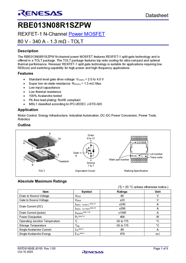 RBE013N08R1SZPW 80V, 340A, 1.3mΩ, REXFET-1 N-Channel Power MOSFET in TOLT