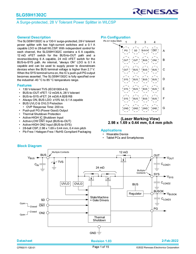 SLG59H1302C 28V Tolerant, 24mΩ/12mΩ, 6A Power Splitter with Surge Protection and Revers...