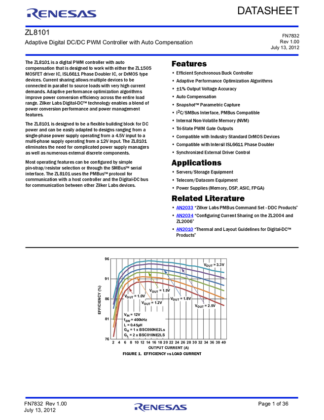 ZL8101 Adaptive Digital DC/DC PWM Controller with Auto Compensation