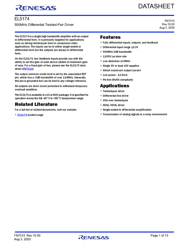EL5174 550MHz Differential Twisted-Pair Drivers