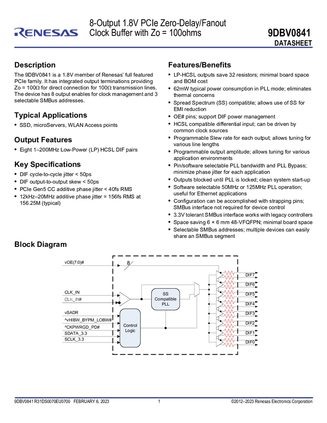 9DBV0841 8-Output 1.8V PCIe Gen 1-3 Zero-Delay/Fanout Clock Buffer