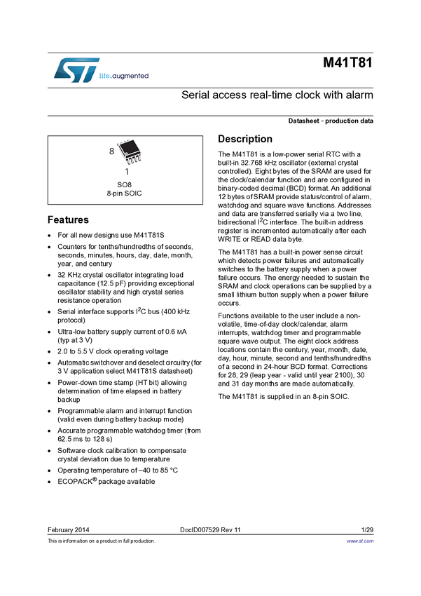 Układ scalony; M41T81M6F; IC; układ RTC; I2C, serial; SRAM; 20BSRAM; 2...5,5V; SO8; SMD; STMicroelectronics; RoHS