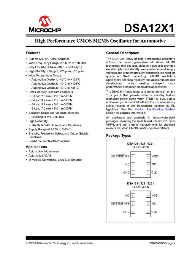 DSA1201 DSA12x1 - High Performance CMOS MEMS Oscillator for Automotive