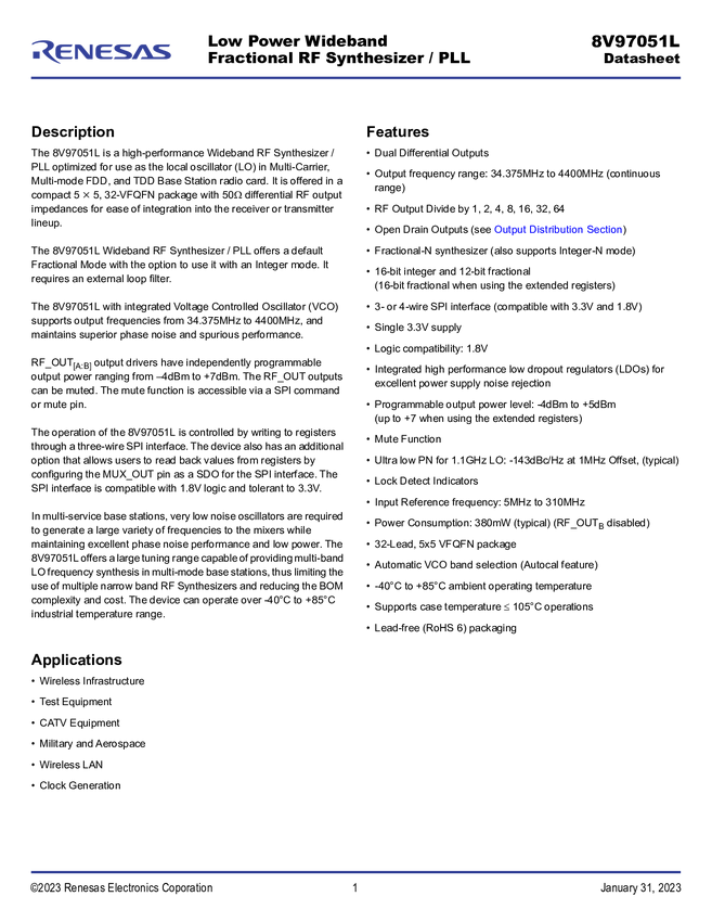 8V97051LNLGI Low Power Wideband Fractional RF Synthesizer