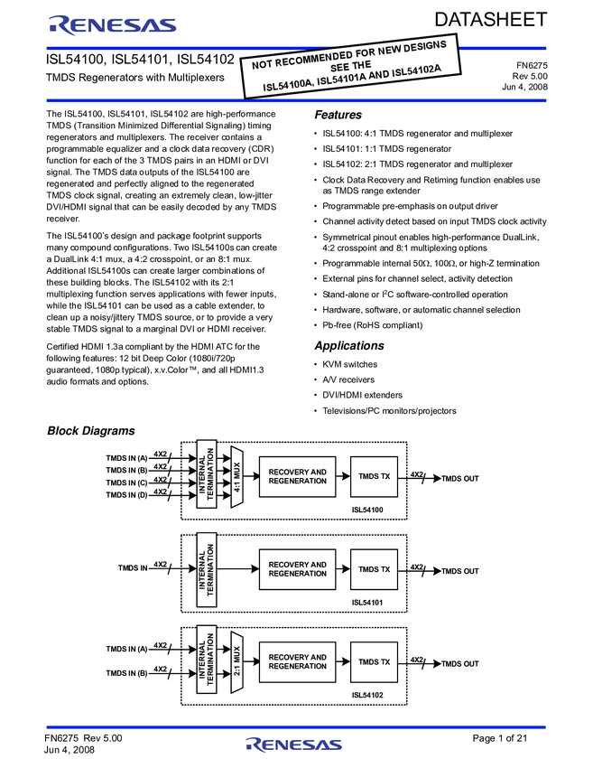 ISL54102CQZ TMDS Regenerators with Multiplexers