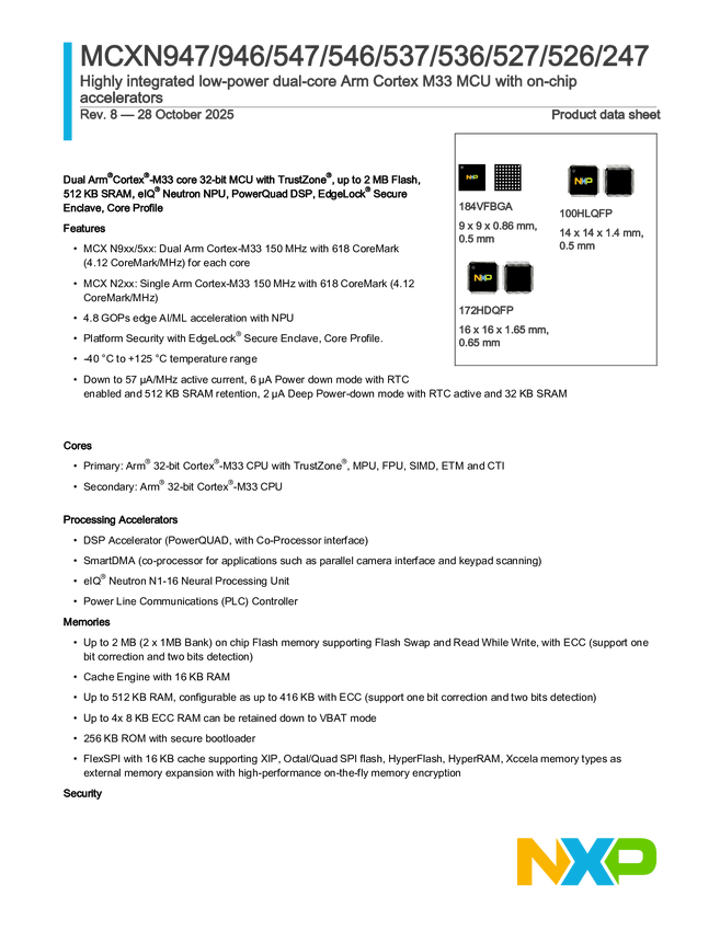 - MCXN546VDFT, MCXN547VDFT, MCX-N9XX-EVK, MCX-N5XX-EVK, MCXN947VKLT, MCXN527VDFT, MCXN536VPBT, MCXN547VPBT, MCXN536VKLT, MCXN537VAB, MCXN247VDFT, MCXN947VDFT, MCXN537VKLT, MCXN247VAB, MCXN527VKLT, MCXN946VDFT, MCXN526VKLT, MCXN546VPBT, MCXN946VKLT, MCXN536VAB, MCXN537VDFT, MCXN526VDFT
