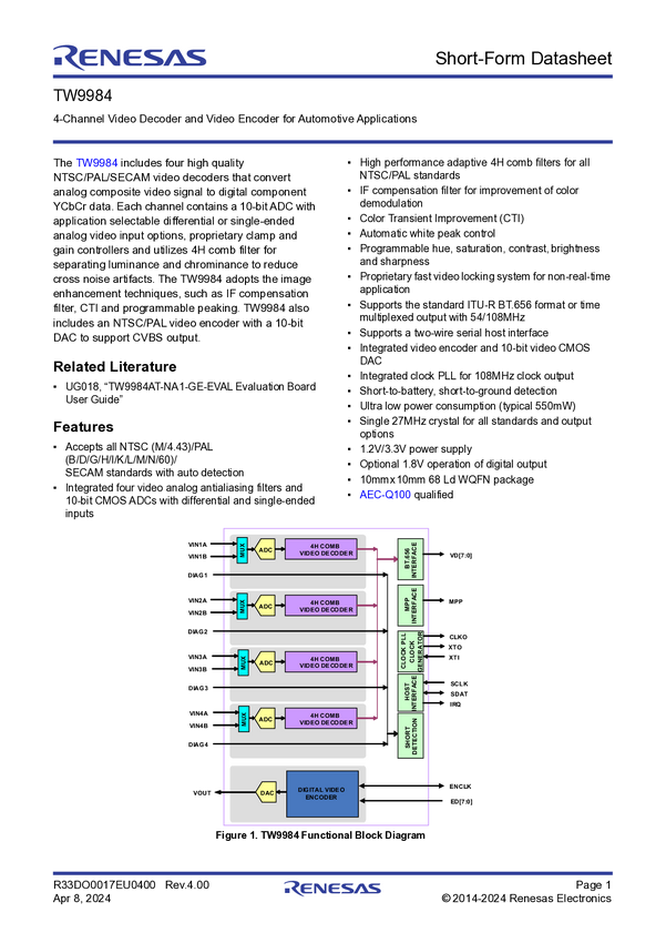 TW9984 4-Channel Video Decoder and Video Encoder for Automotive Applications