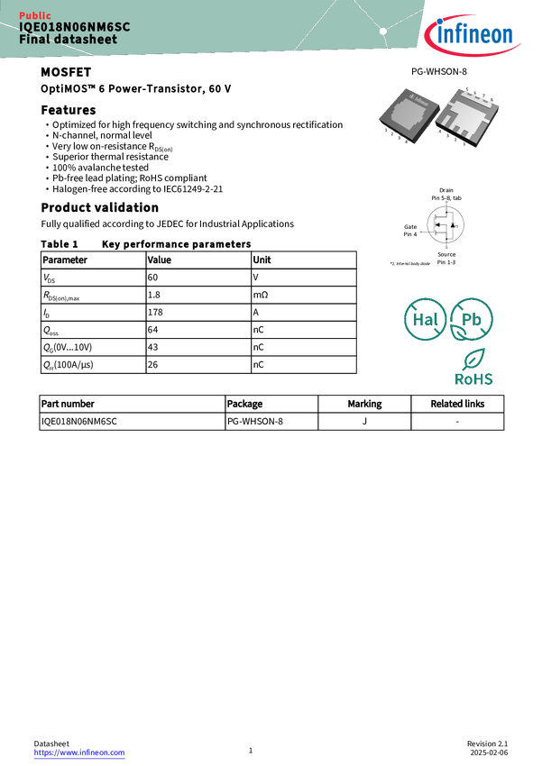 IQE018N06NM6SC OptiMOS™ 6 60 V - the latest power MOSFET technology setting the new indust...
