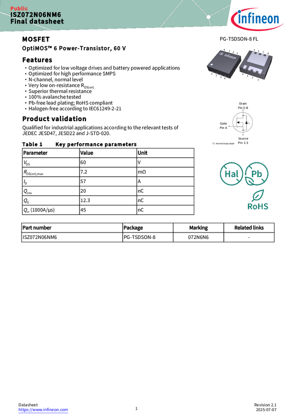 ISZ072N06NM6 OptiMOS™ 6 60 V - the latest power MOSFET technology setting the new indust...