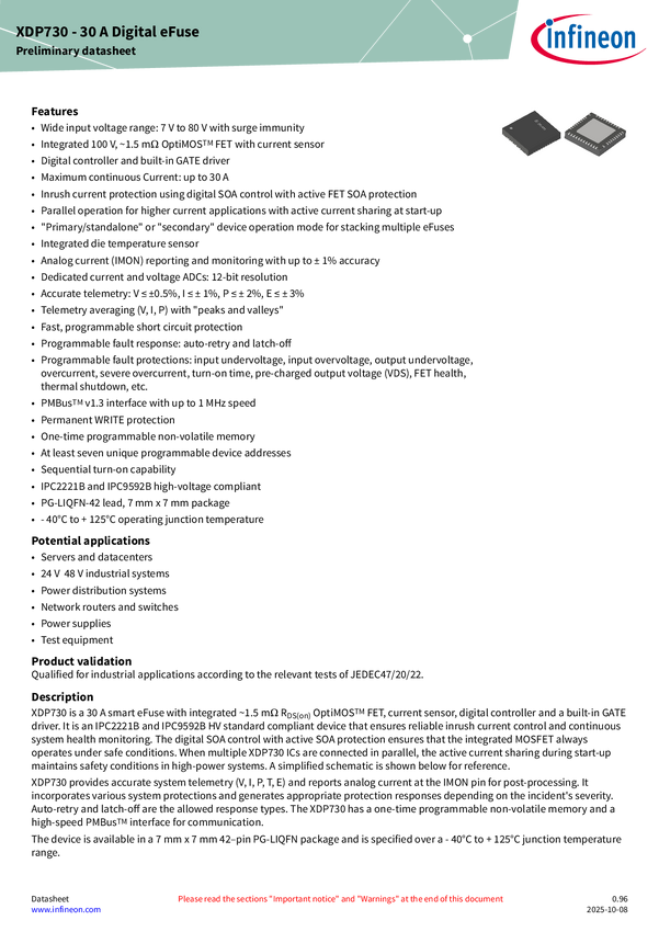 Stackable 30 A, 1.5 mΩ electronic fuse (eFuse) with PMBus® interface for 7 V to 80 V DC rails in a small LIQFN-42 package Infineon's XDP730-001 eFuse integrates a hot-swap controller, a low RDS(on) FET with up to 30 A current carrying capability, and a current sense in a small 7 mm x 7 mm package. With its wide operating voltage range, Surge Immunity, telemetry, and extensive list of protection features against e.g., inrush current, under- and overvoltage, and overcurrent, it is especially suitable for sop