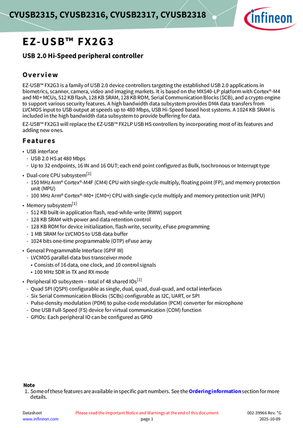 USB 2.0 480 Mbps controller with crypto-engine, Quad-SPI, SPI, CAN, I2C, UART support (tape & reel) EZ-USB™ FX2G3 is a family of highly-integrated USB 2.0 controllers serving as the basis for any 480 Mbps USB peripheral device. CYUSB2318-BF104AXIT is the most advanced variant of this family, with dual-core ARM® Cortex® M4F & M0+ CPUs, crypto-engine and Quad-SPI, SPI, CAN, I2C, UART support. [T&R packing]