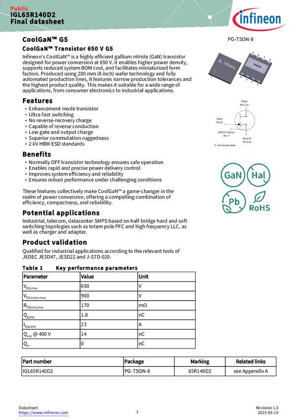 CoolGaN™ Transistor 650 V G5 The IGL65R140D2 GaN power transistor allows for increased efficiency at high-frequency operation. As part of the CoolGaN™ G5 family, it meets the highest quality standards, enabling highly reliable designs with superior efficiency. Housed in a bottom-side cooled ThinPAK package, it is well-suited for consumer applications with slim form factors.