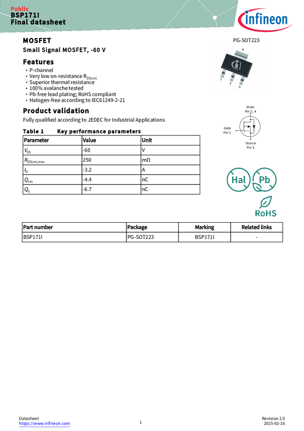 BSP171I Industrial grade P-channel power MOSFET in SOT223 package, reducing design...