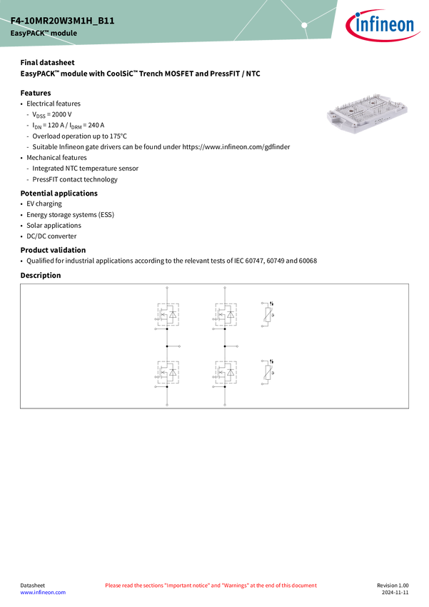 F4-10MR20W3M1H-B11 CoolSiC™ MOSFET fourpack module 2000 V EasyPACK™ 3BCoolSiC™ MOSFET fourpac...