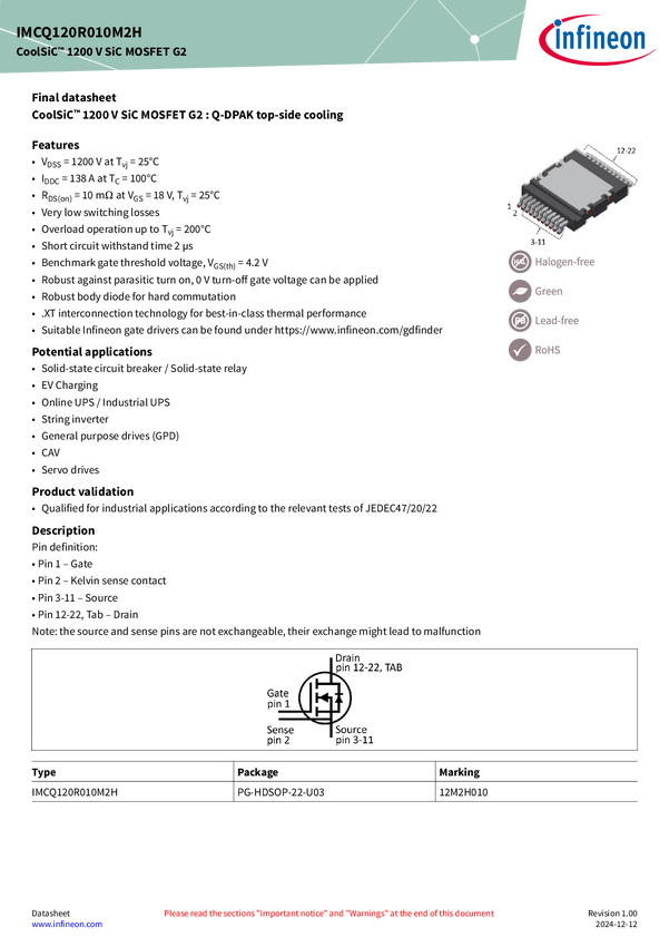 IMCQ120R010M2H CoolSiC™ MOSFET discrete 1200 V G2 in top-side cooled Q-DPAK package CoolS...