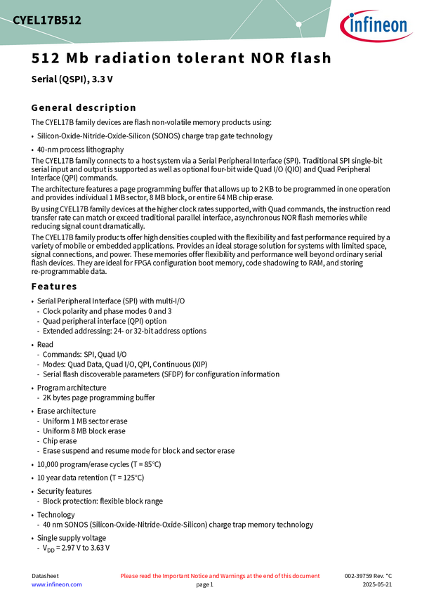 CYEL17B512-133AZM Radiation tolerant, highly reliability, 512 Mbit QSPI NOR Flash for NewSpac...