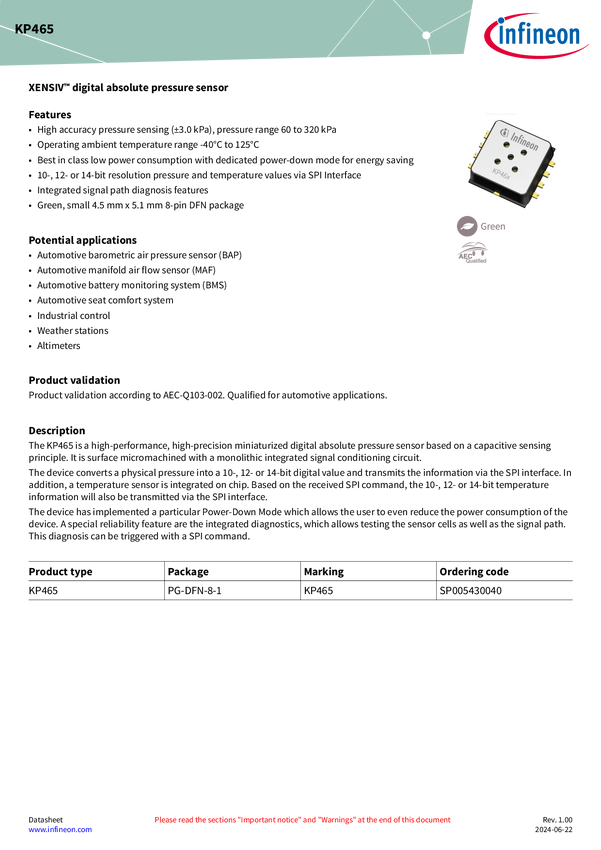 XENSIV™ - KP465 air pressure sensor for fuel-cell systems and industry applications The KP465 is a high-precision miniaturized digital absolute pressure sensor using a capacitive sensing principle. It converts pressure into a 10-, 12- or 14-bit digital value transmitted via SPI interface and integrates an on-chip temperature sensor. It also features a Power-Down Mode for reduced power consumption and integrated diagnostics for sensor and signal path testing, triggered via SPI command for added reliability.