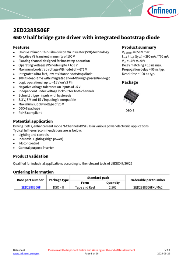 2ED2388S06F 650 V half-bridge gate driver with integrated bootstrap diode