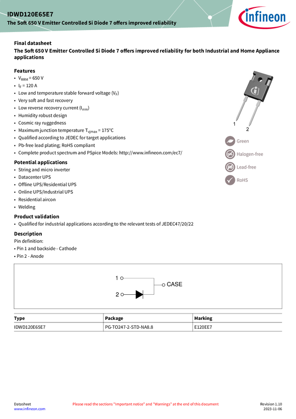 IDWD120E65E7 650 V silicon power diode in TO-247-2 2pin package Soft-switching 650 V, 1...