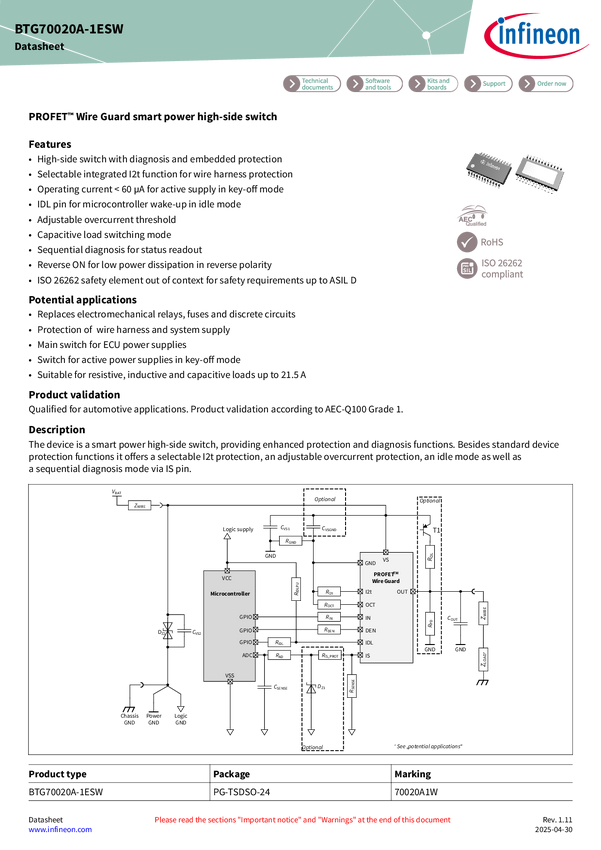 12 V | 2.2 mΩ | 21.5 A | integrated I²t wire protection| automatic Idle mode | 1 channel smart high-side power switch | analog current sense, sequential diagnosis | PG-TSDSO-24 | ISO 26262-compliant | PROFET™ Wire Guard 12V The single-channel high-side power switch BTG70020A-1ESW, member of the PROFET™ Wire Guard family, is designed for wire protection in modern automotive E/E architectures. It is equipped with integrated I²t wire protection, and enhanced diagnostic capabilities. Its adjustable overcurrent