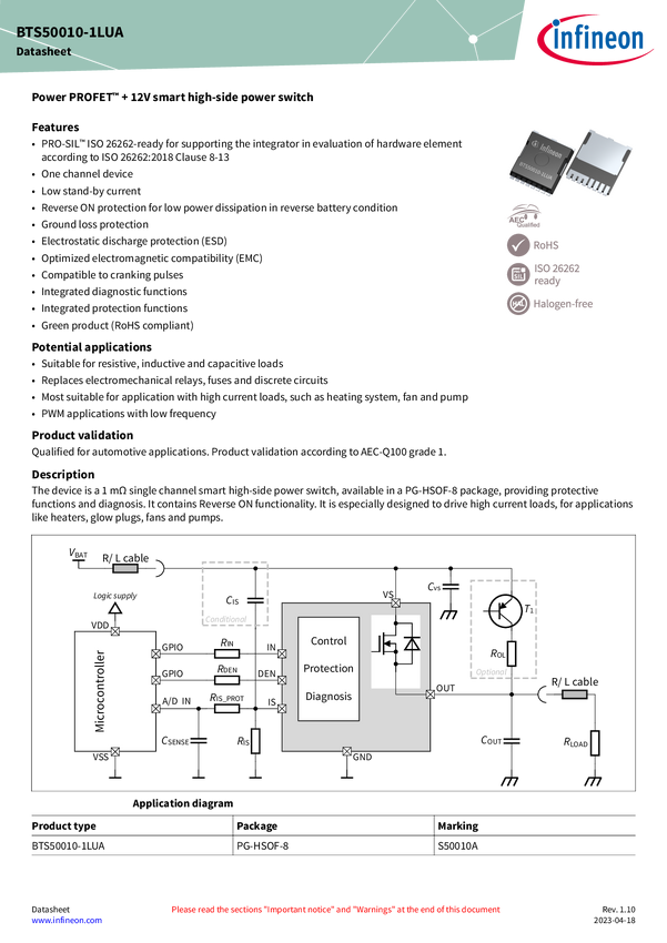Single channel smart high-side power switch providing protective functions and diagnosis Introducing BTS50010-1LUA, a new member of Power PROFET™ +12V family. This 1.0mΩ single channel high-side power switch comes in an 8-pin TO-leadless package. It offers reverse polarity protection and diagnosis, with a N-channel power MOSFET and charge pump. Ideal for harsh automotive environments, it can drive loads up to 42A, powering heaters, glow plugs, fans, and pumps.