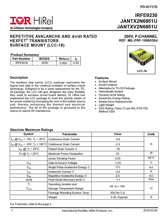 IRFE9230 is a high reliability, -200V, single, P-channel MOSFET in a 18-pin LCC pack...
