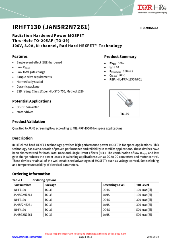 - JANSG2N7261, JANSF2N7261, IRHF7130