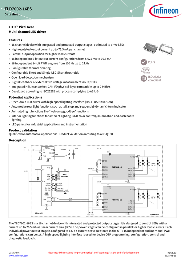 Multi-channel LED driver The TLD7002-16ES is a 16-channel device with protected output stages. It controls LEDs up to 76.5 mA as linear current sink (LCS). Power stages can be parallelized for higher load currents. Each output stage is configured with a 6-bit current value stored in OTP. 16 independent PWM configurations are available. A high-speed interface enables OTP programming, configuration, control, and diagnostics.