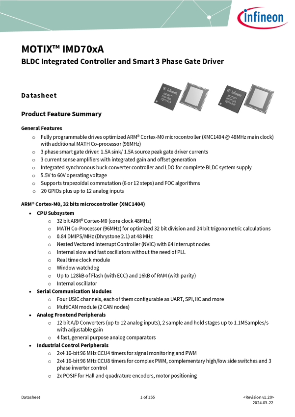 MOTIX™ fully programmable motor controller combining microcontroller and gate driver IC MOTIX™ IMD701A is a high performance motor controller integrating XMC1404 microcontroller with 6EDL7141 3-phase gate driver IC in one package. XMC1404, ARM® Cortex®-M0 based microcontroller incorporates dedicated features to improve system performance of motor drives control. An integrated MATH Co-Processor clocked at 96MHz enhances calculations including division and trigonometric functions commonly used in Field Orien