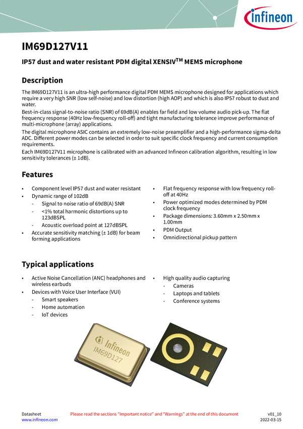 IM69D127 High performance XENSIV™ MEMS microphone in a small 3.6 x 2.5mm package IM...