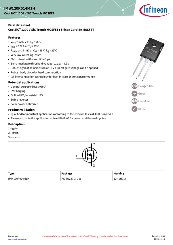 IMW120R014M1H CoolSiC™ 1200 V, 14 mΩ SiC Trench MOSFET in TO247-3 package CoolSiC™ MOSFE...