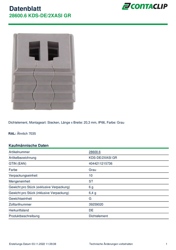 28600.6 CONTA-CLIP 28600.6 Element uszczelniający KDS-DE/2XASI GR, (D x S x W) 20.3...