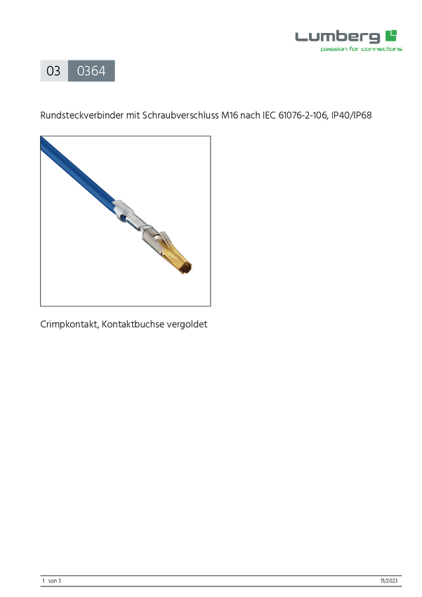 Lumberg 0364 V109 VP18 Styk zaciskany Łączna ilość styków: 1 1 szt.