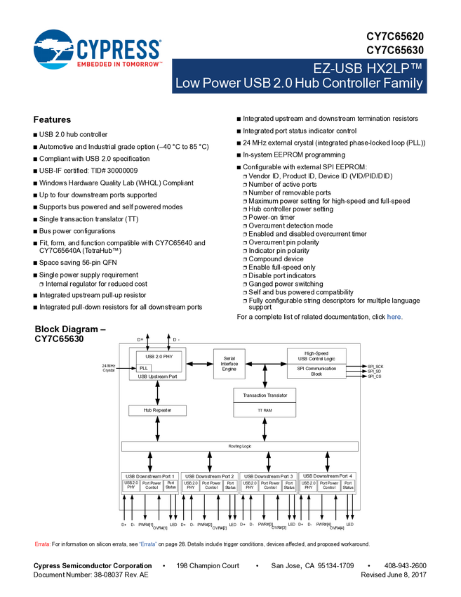 CY7C65630-56LTXCKGG, CY7C65630-56LTXI, CY7C65630-56LTXCT, CY7C65630-56LTXC, CY7C65620-56LTXIT, CY7C65620-56LTXI, CY7C65620-56LTXCT, CY7C65620-56LTXC